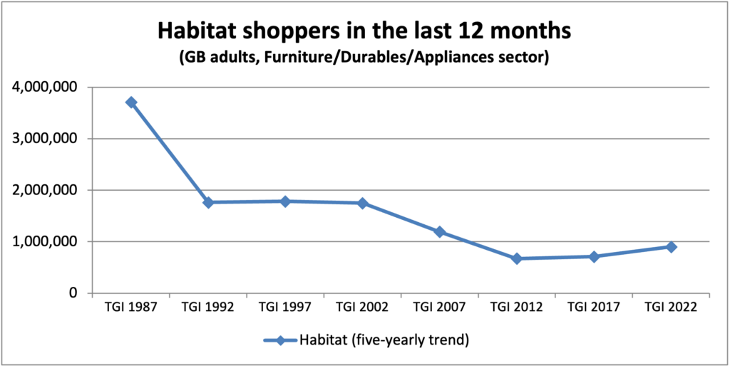 TGI data held within the Archive track the story from the mid-1980s high-point onwards. As we can see, the number of Habitat shoppers declined from 3.7 million in 1987 to under 700,000 in 2012, but saw an uptick to 900,000 in the brand’s new guise by 2022.
