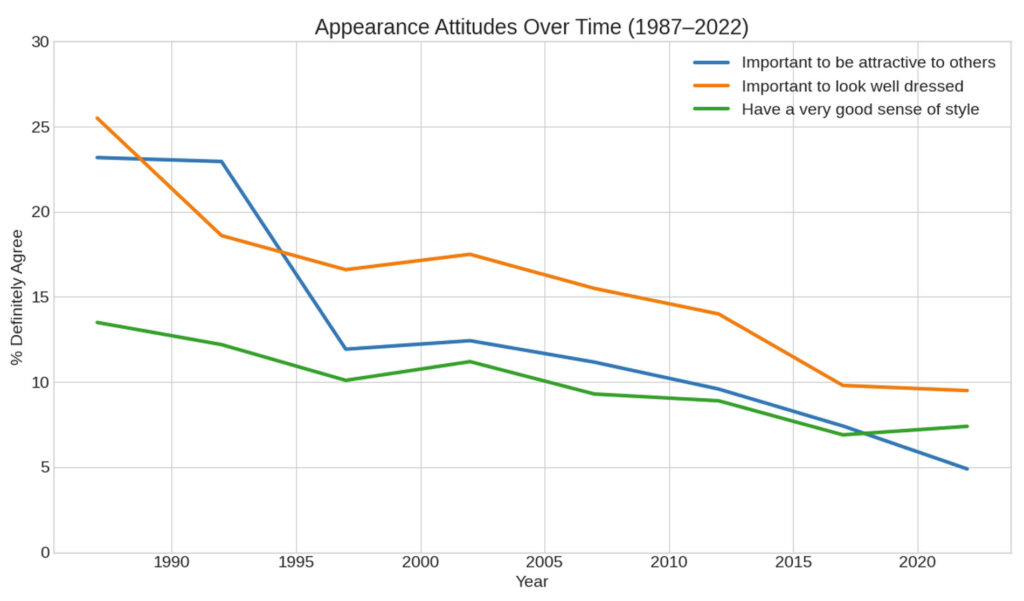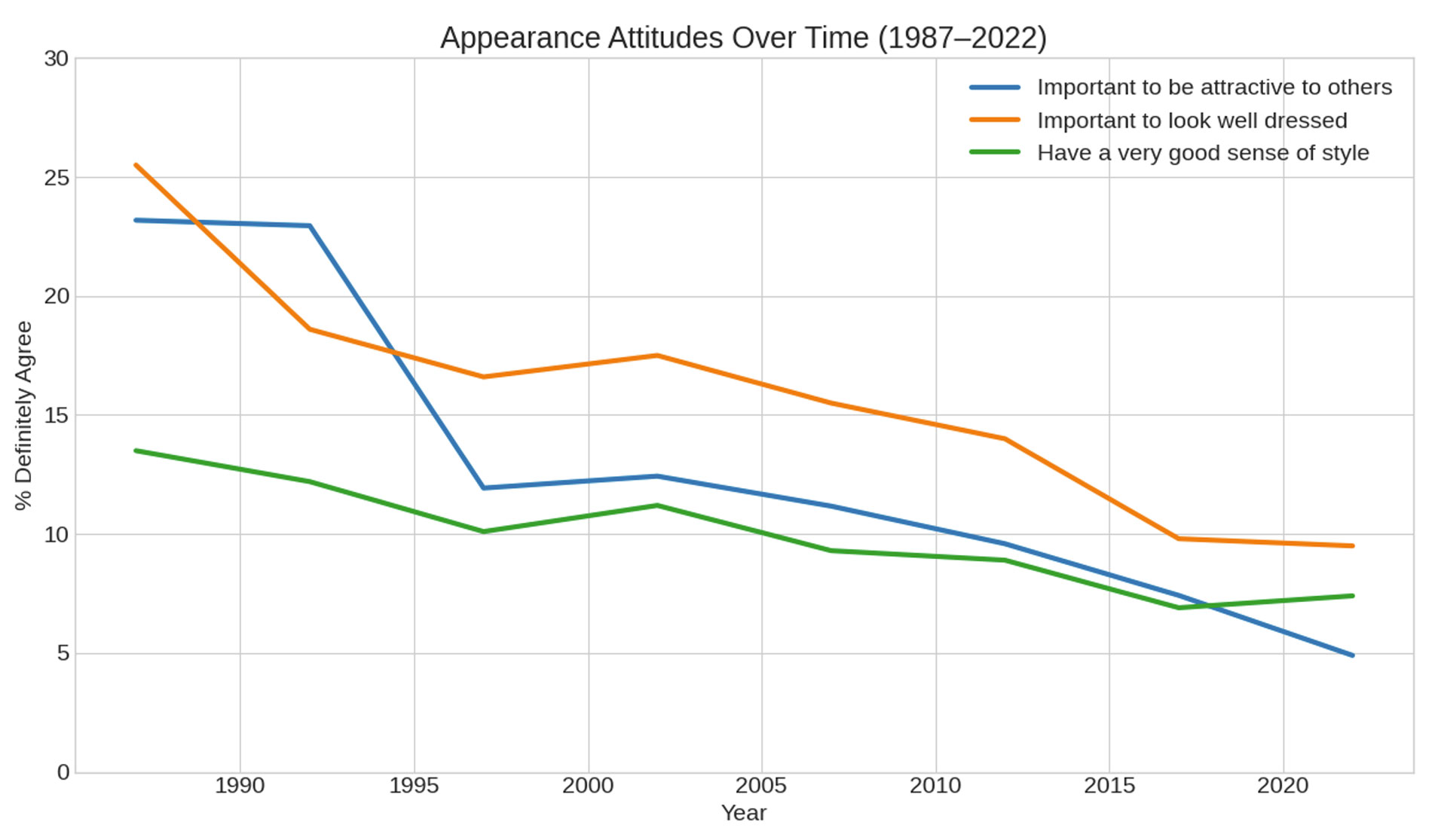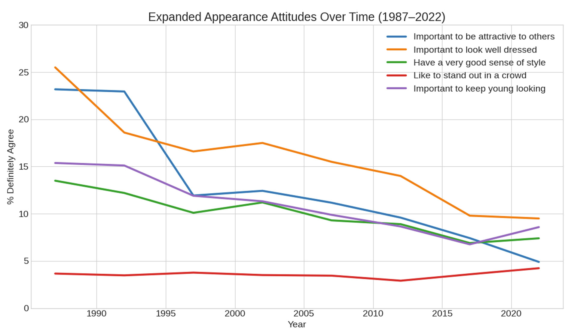 However, that is maybe just cherry picking – if we add some others: “I like to stand out in a crowd” and “It is important to keep young looking” (see chart below), the trends on the new statements are much flatter. This may be that exhibitionism has nothing to do with dress sense and that keeping young-looking is less important in an aging society. But nevertheless the general declines are significant.